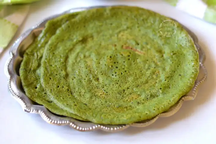 - Soak and Prepare Batter: Rinse and soak the quinoa and all dals together in water for 4-6 hours (or overnight). Drain, then blend with ginger, green chili, cumin, moringa leaves, and a pinch of salt into a smooth, pourable batter. Add water gradually to achieve a thin, crepe-like consistency (about 1/2 cup total batter). Let it ferment covered in a warm spot for 6-8 hours (or overnight) – this boosts probiotics and flavor.