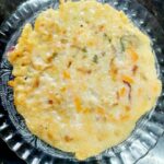 • In a mixing bowl, combine the oat flour, chopped onions, tomatoes, bell peppers, grated carrot, green chilies, fresh coriander leaves, cumin seeds, salt, red chili powder, and turmeric powder.